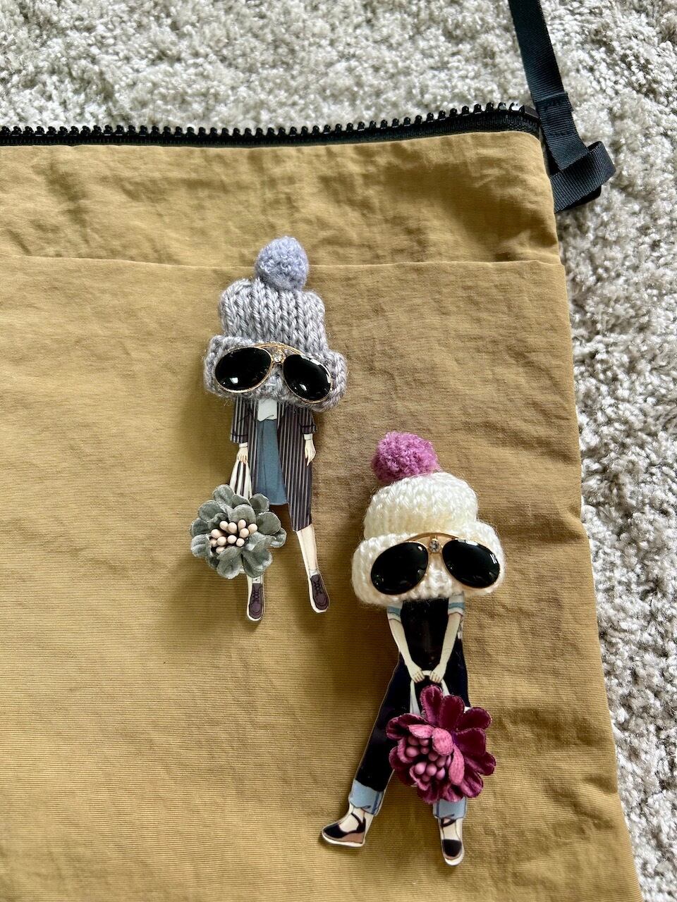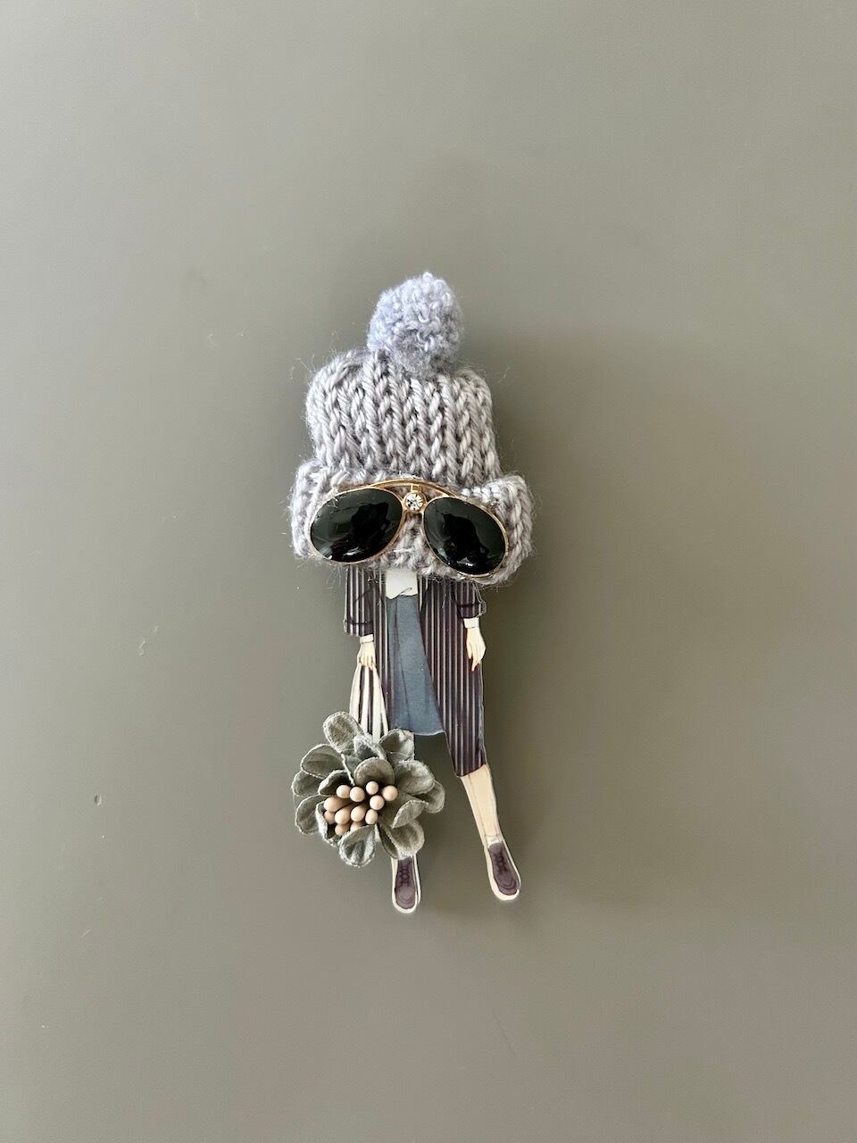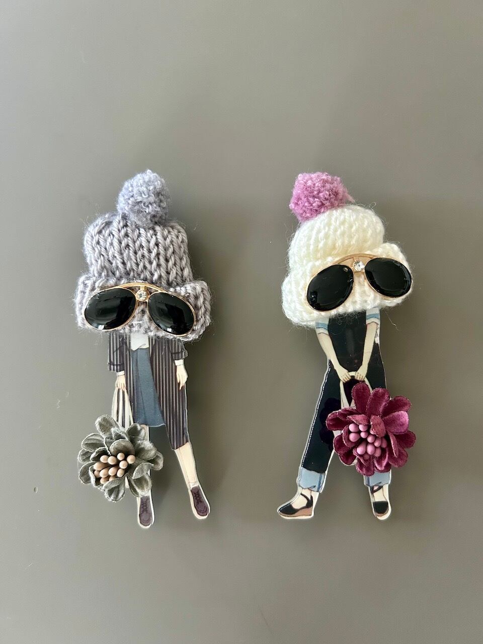 ニット帽とサングラスが印象的な、おしゃれなガールモチーフのアクリルブローチです。