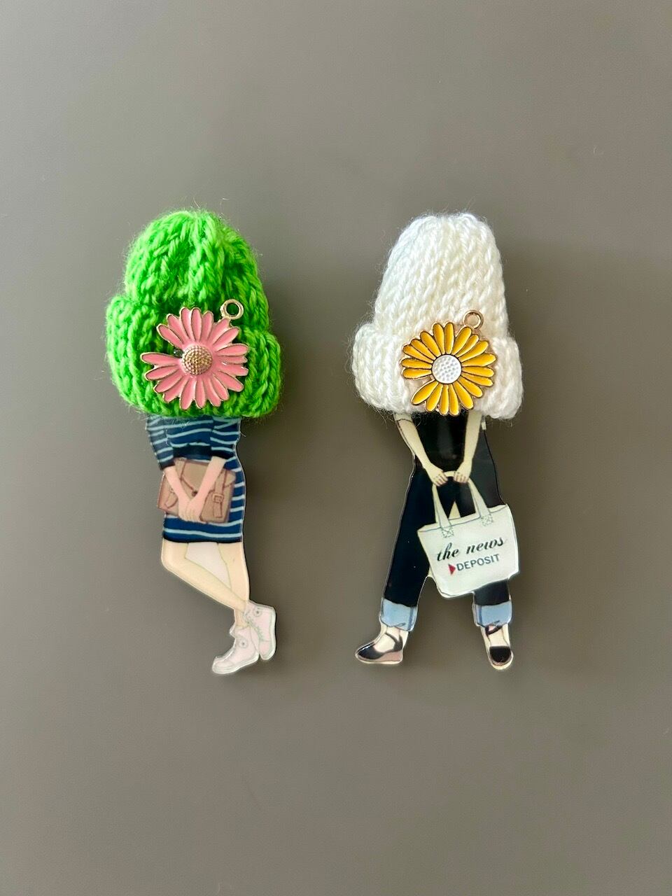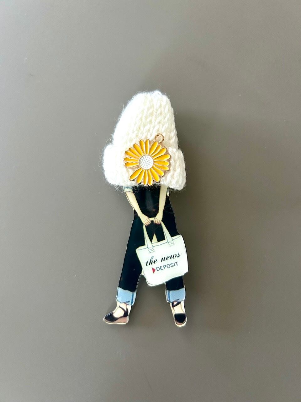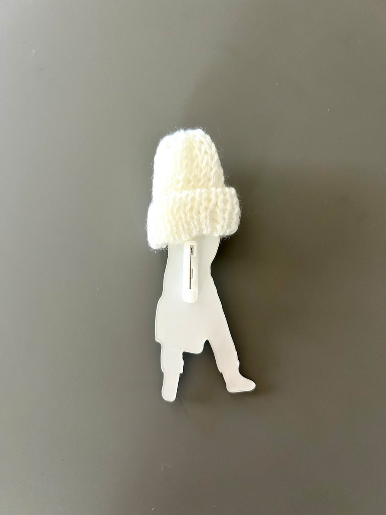 ニット帽とフラワーモチーフがアクセントになった、遊び心あふれるファッションガールのアクリルブローチです。