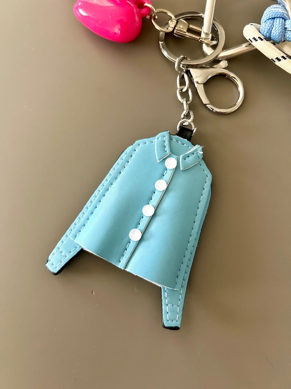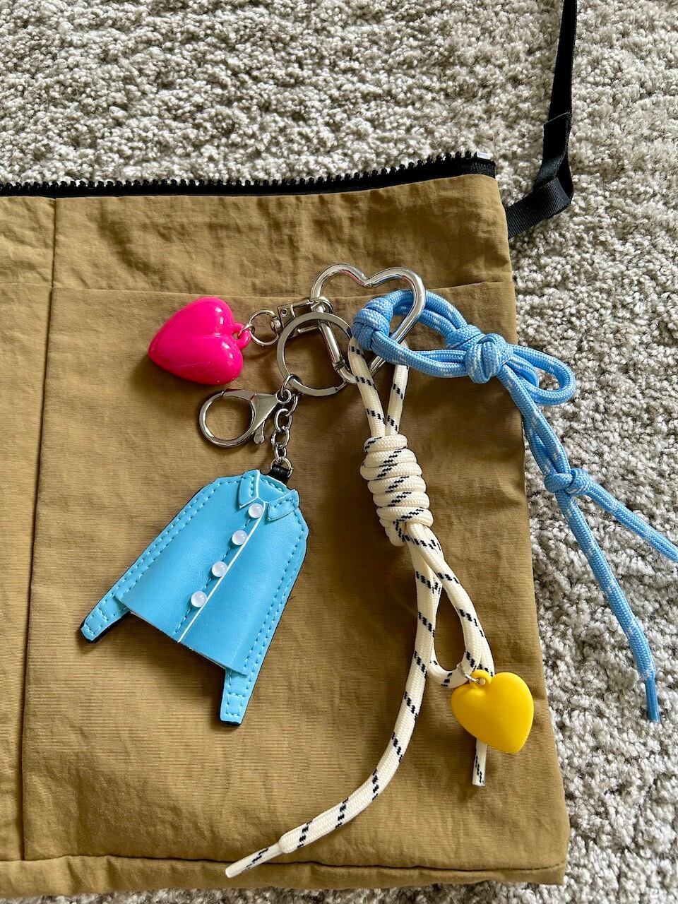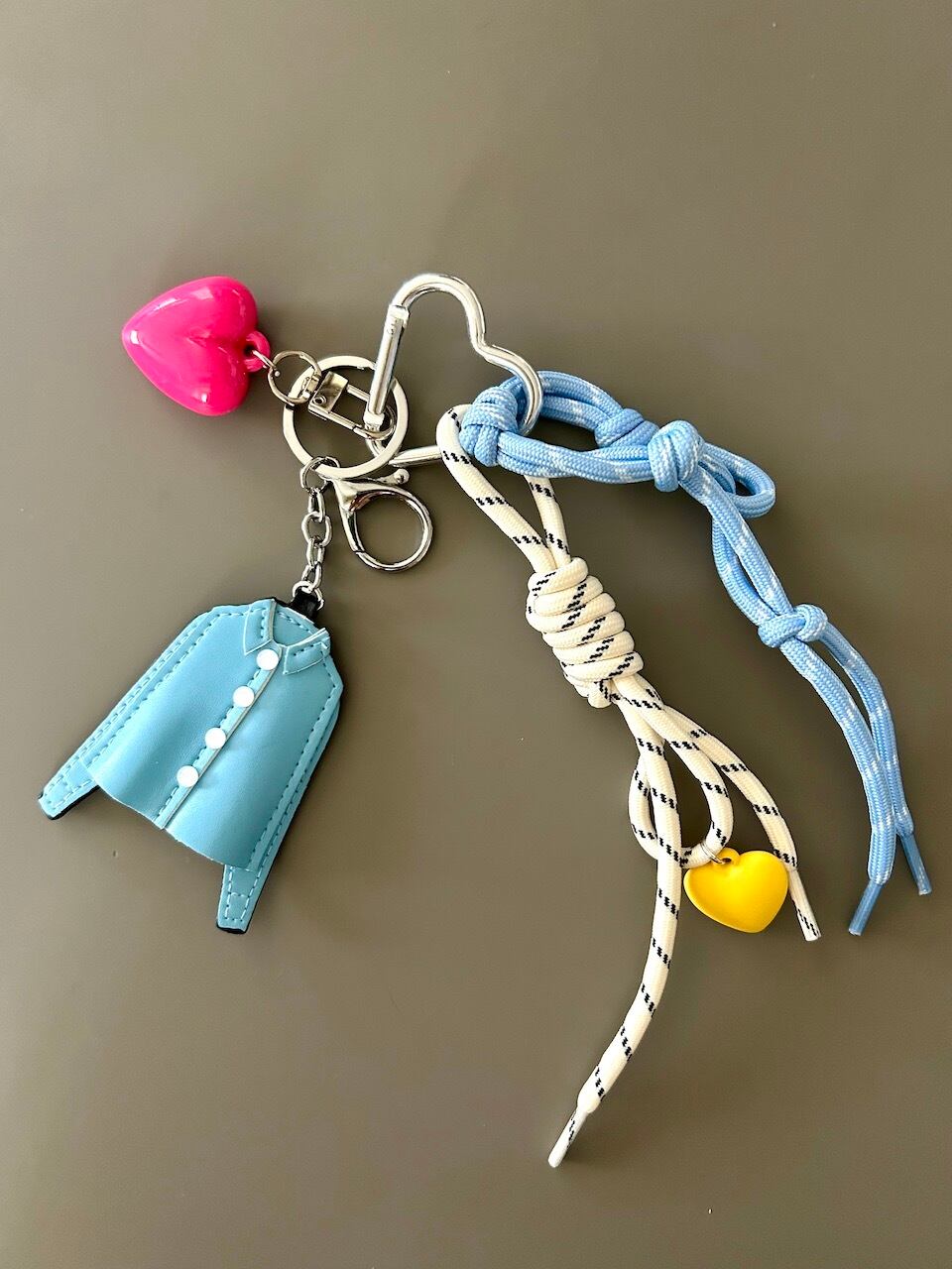 ブルーのジャケットチャームとカラフルなハートモチーフを組み合わせたファッションキーリングです。