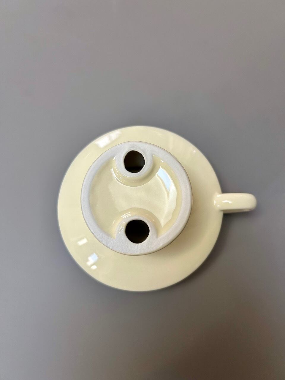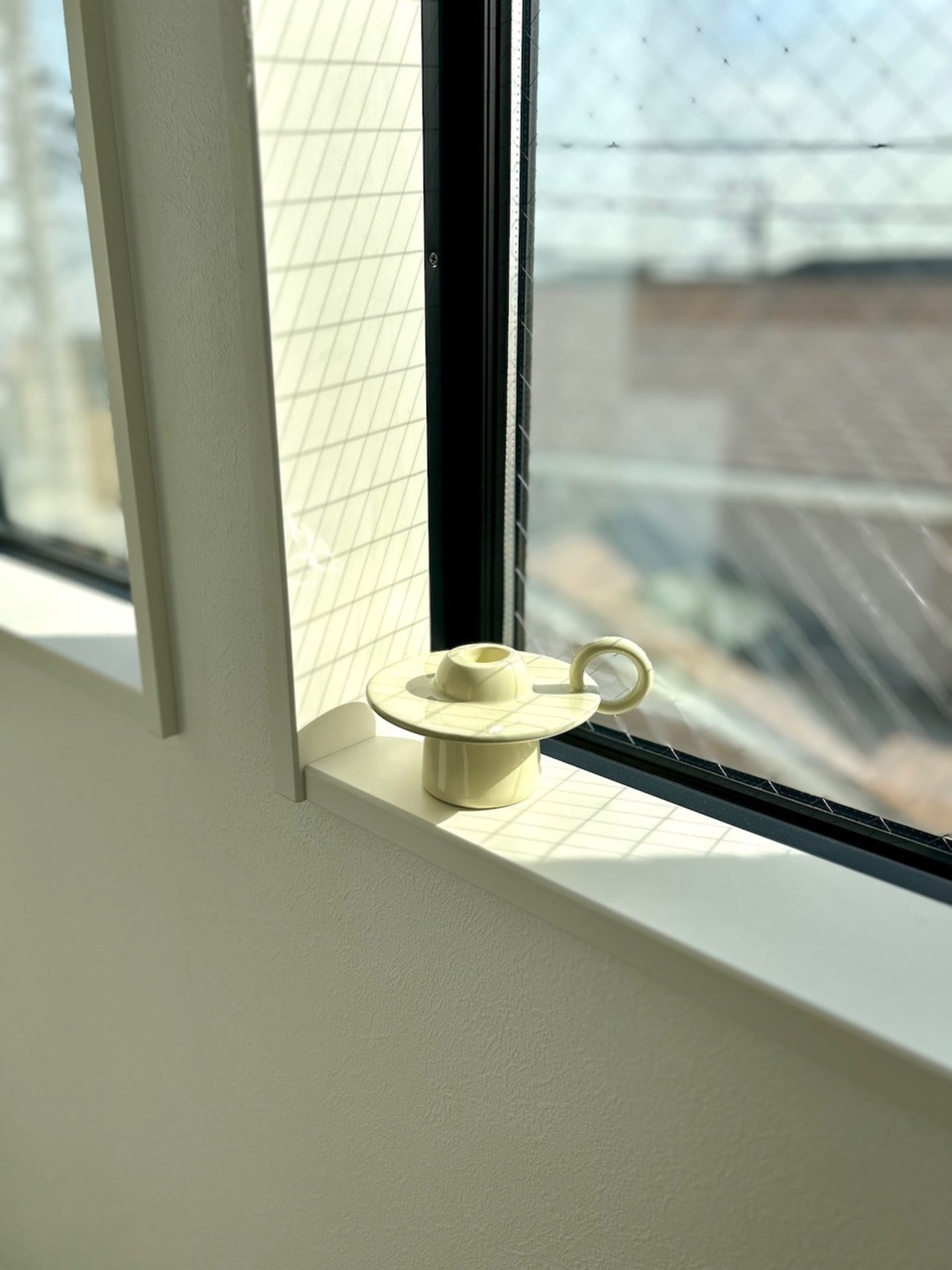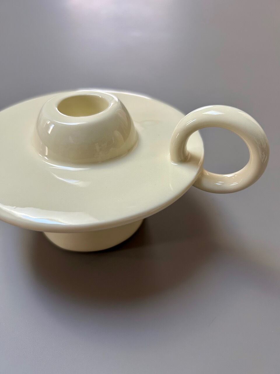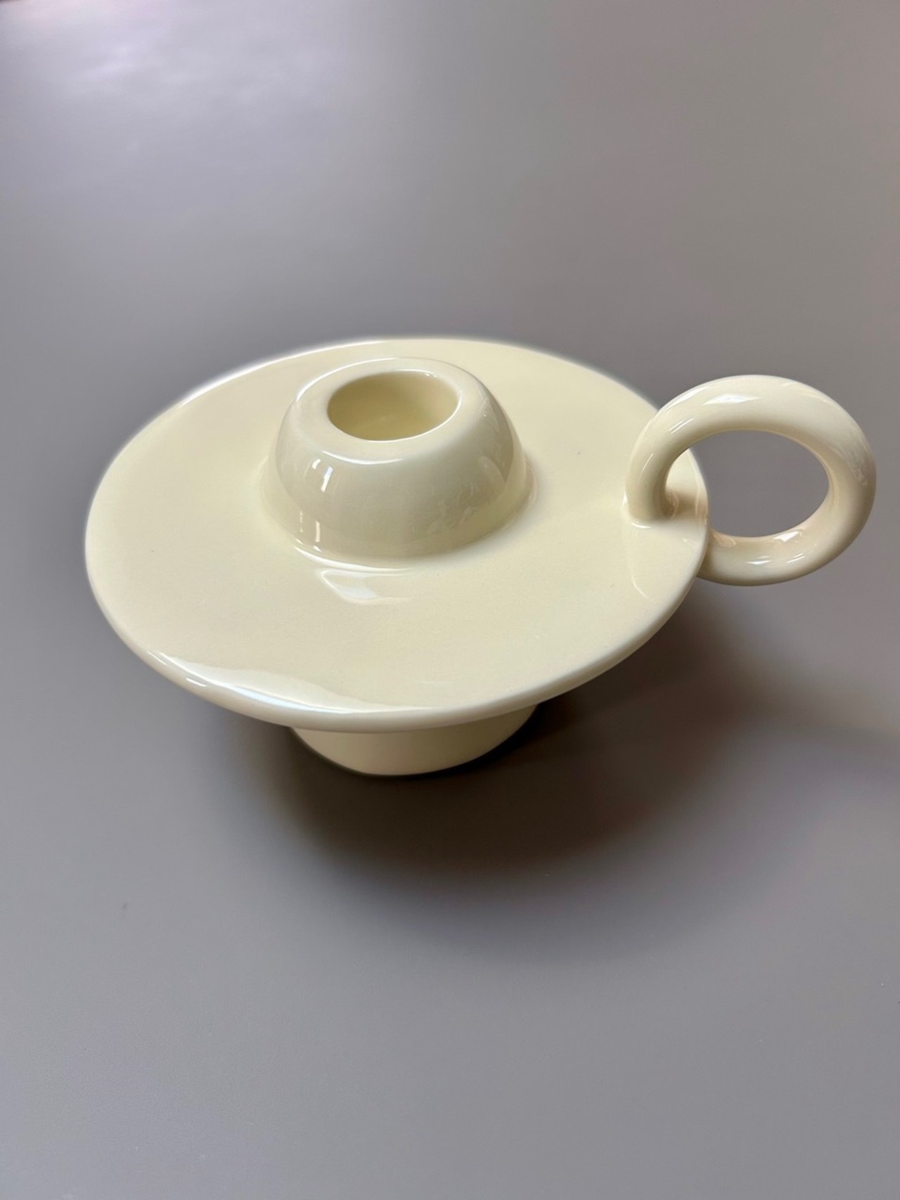 すっきりとしたフォルムと、やわらかなアイボリーカラーが印象的なキャンドルホルダーです 。丸みを帯びた受け皿と持ち手が一体となったユニークな造形は、まるでアートオブジェのような佇まい 。置くだけでお部屋の雰囲気を洗練されたものへと整えてくれます 。