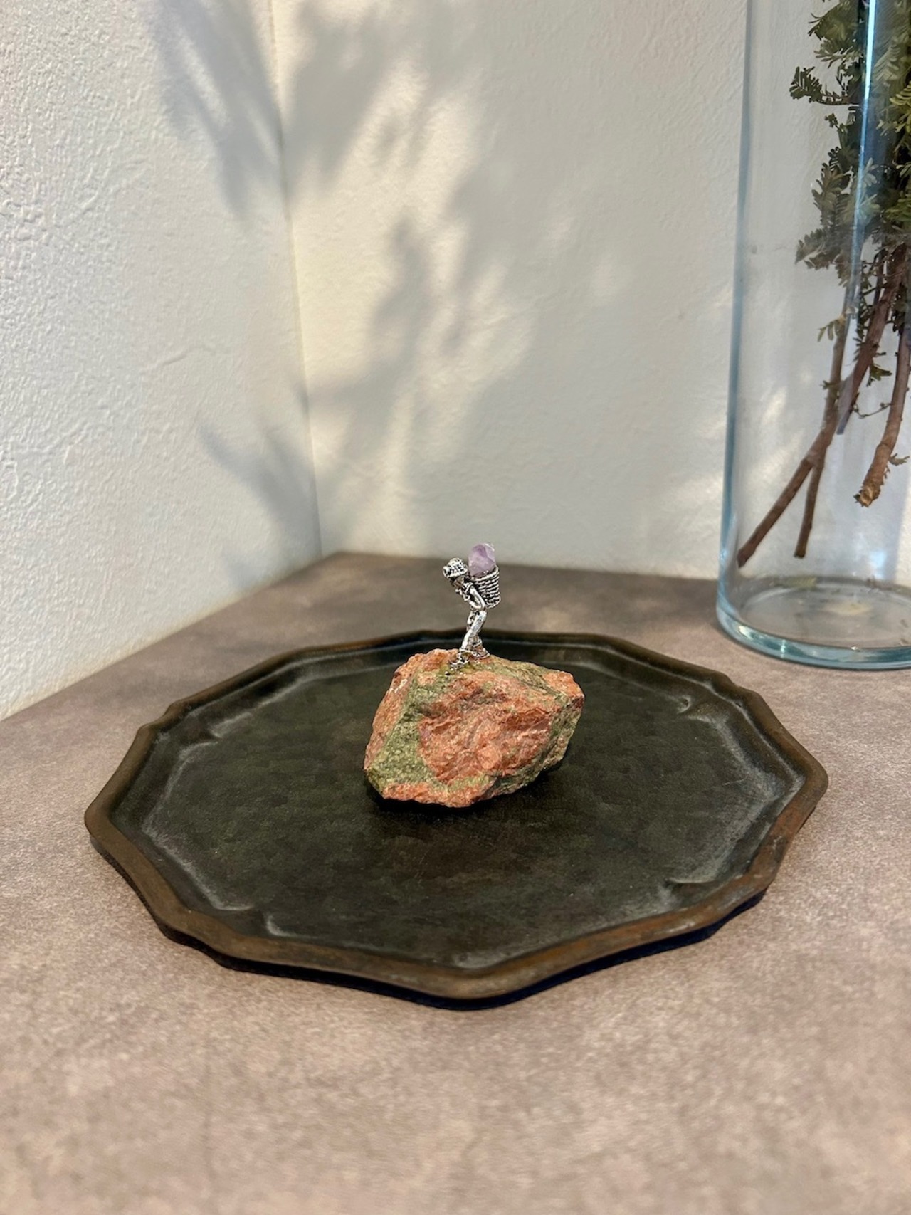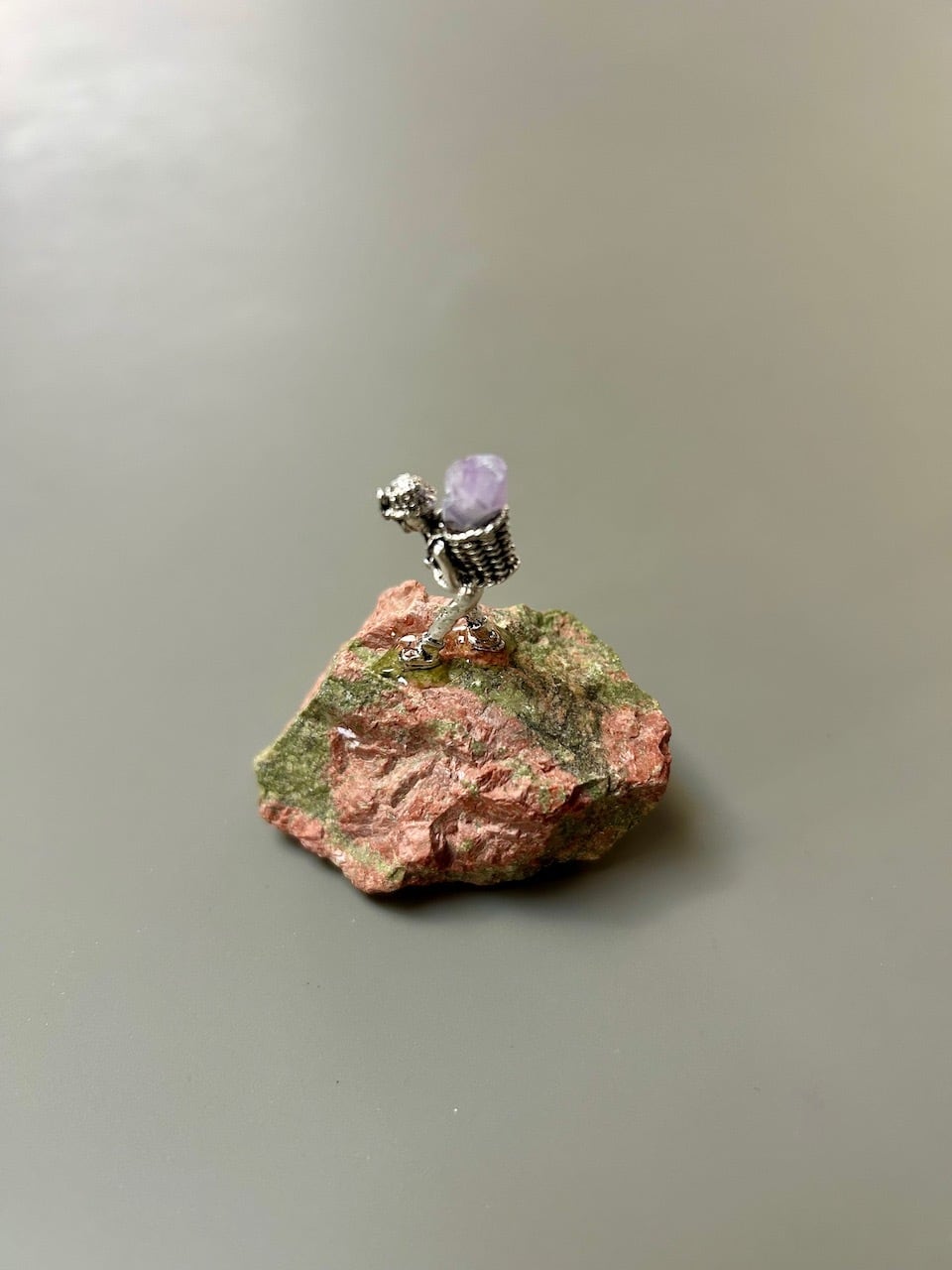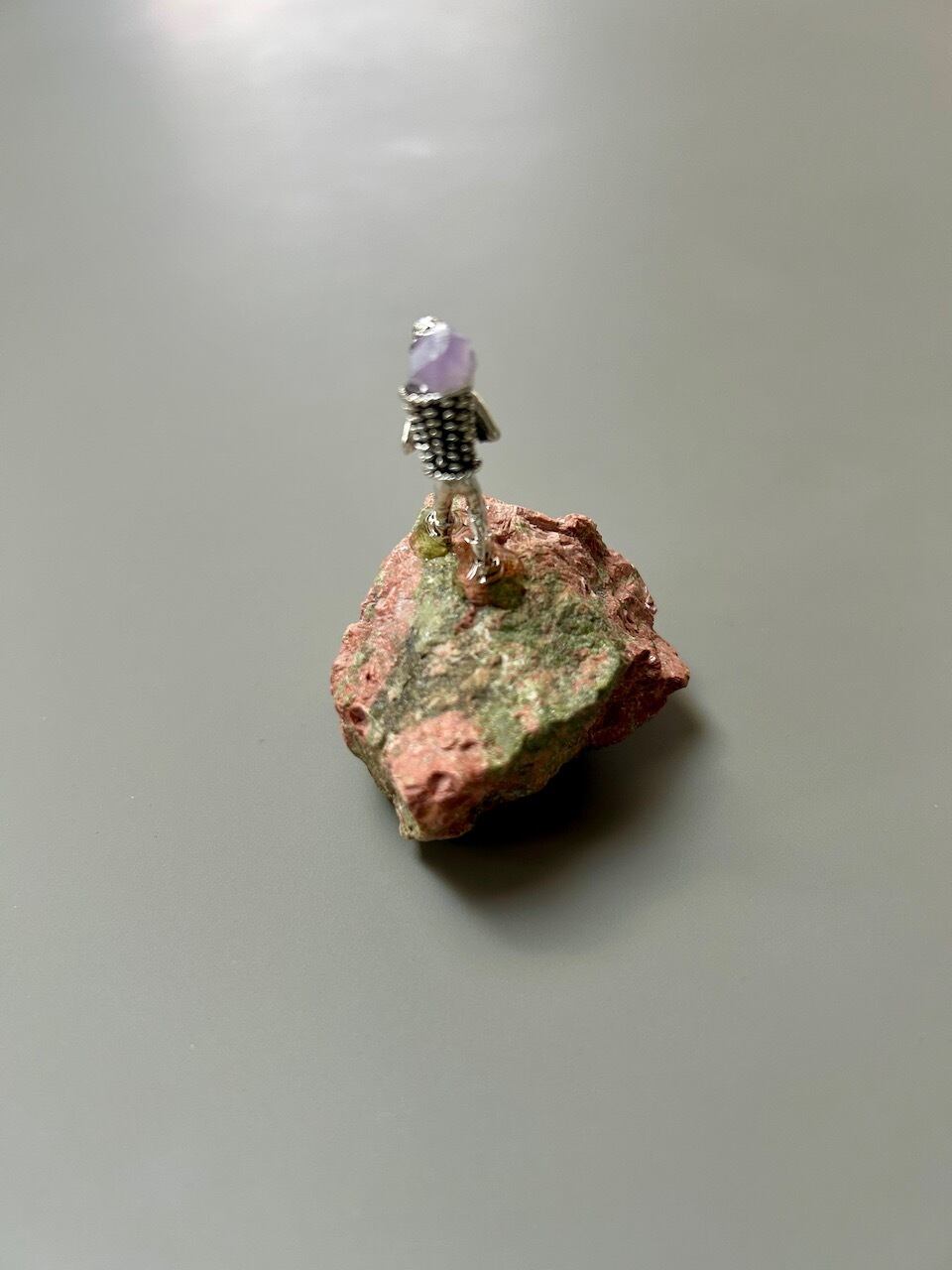 アメジストの原石と、そこを探検する小さなフィギュアが組み合わさったユニークなオブジェです。天然石ならではの自然なフォルムと、ミニチュアの世界観が融合し、デスクや棚の上に小さな物語を運んできてくれます。