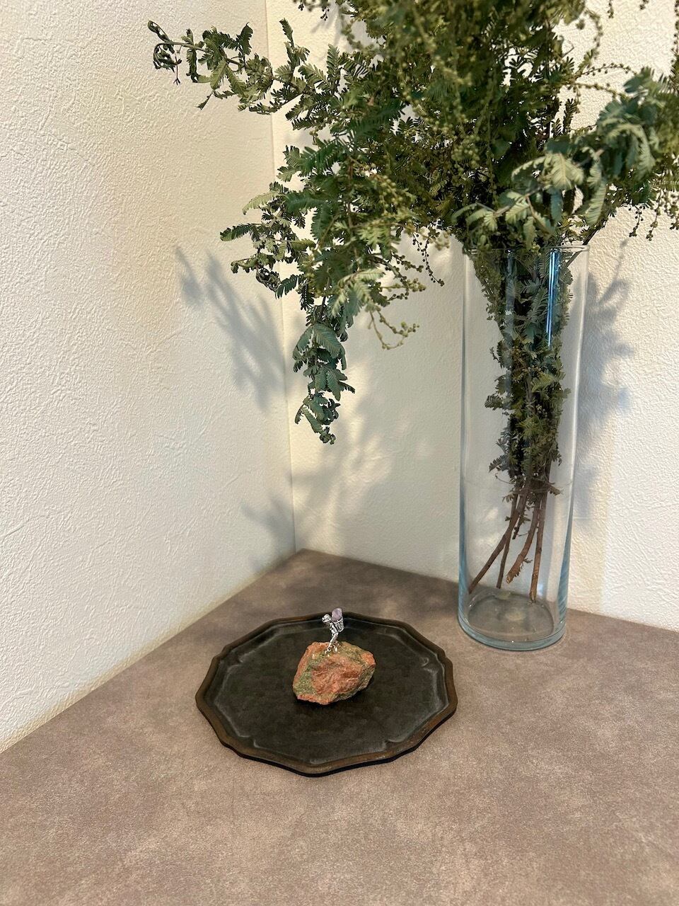 一輪挿しのフラワーベースや他のオブジェの傍にそっと置くだけで、視線を惹きつける個性的なアクセントになります。コンパクトなサイズ感なので、デスク周りや本棚の空いたスペースにも取り入れやすく、日常の中でふと目に入った時に心が和むようなディスプレイを楽しめます。
