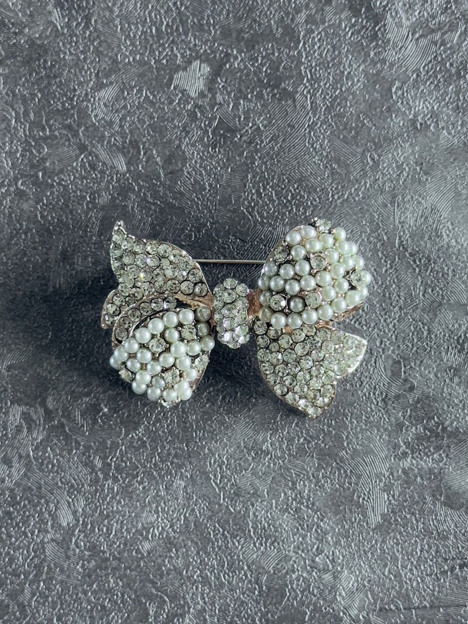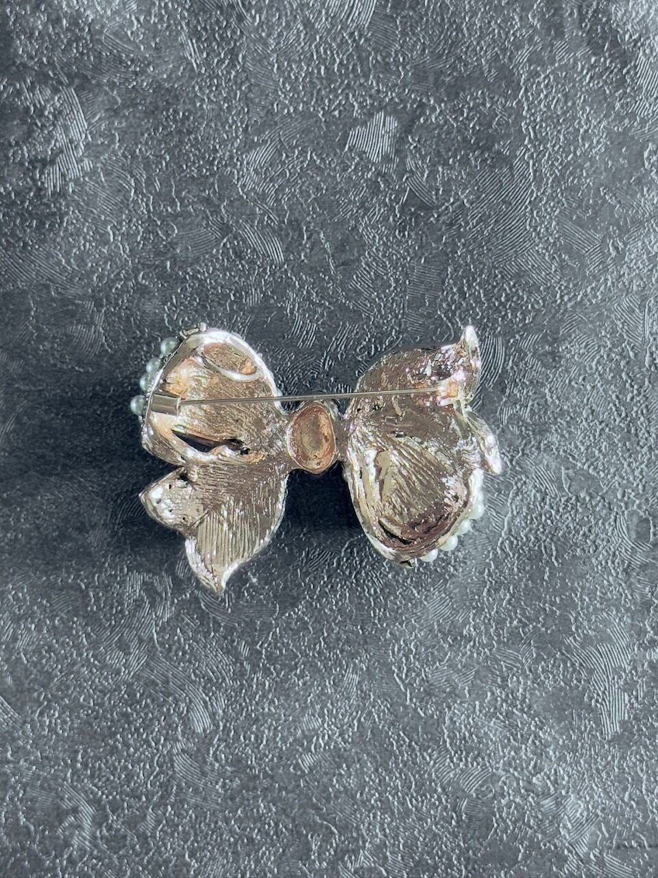 ダイヤモンドの輝きを思わせる、キラキラと輝くラインストーンの装飾が華やかなブローチ。リボンの形をしたデザインが、女性らしさを引き立てます。
