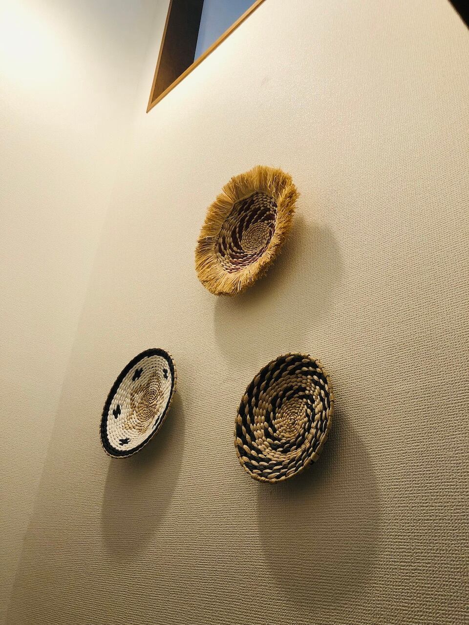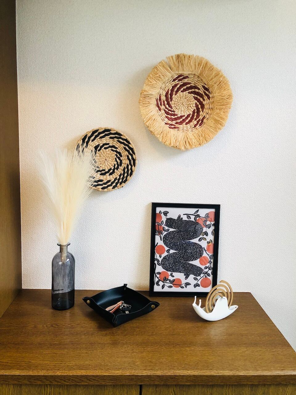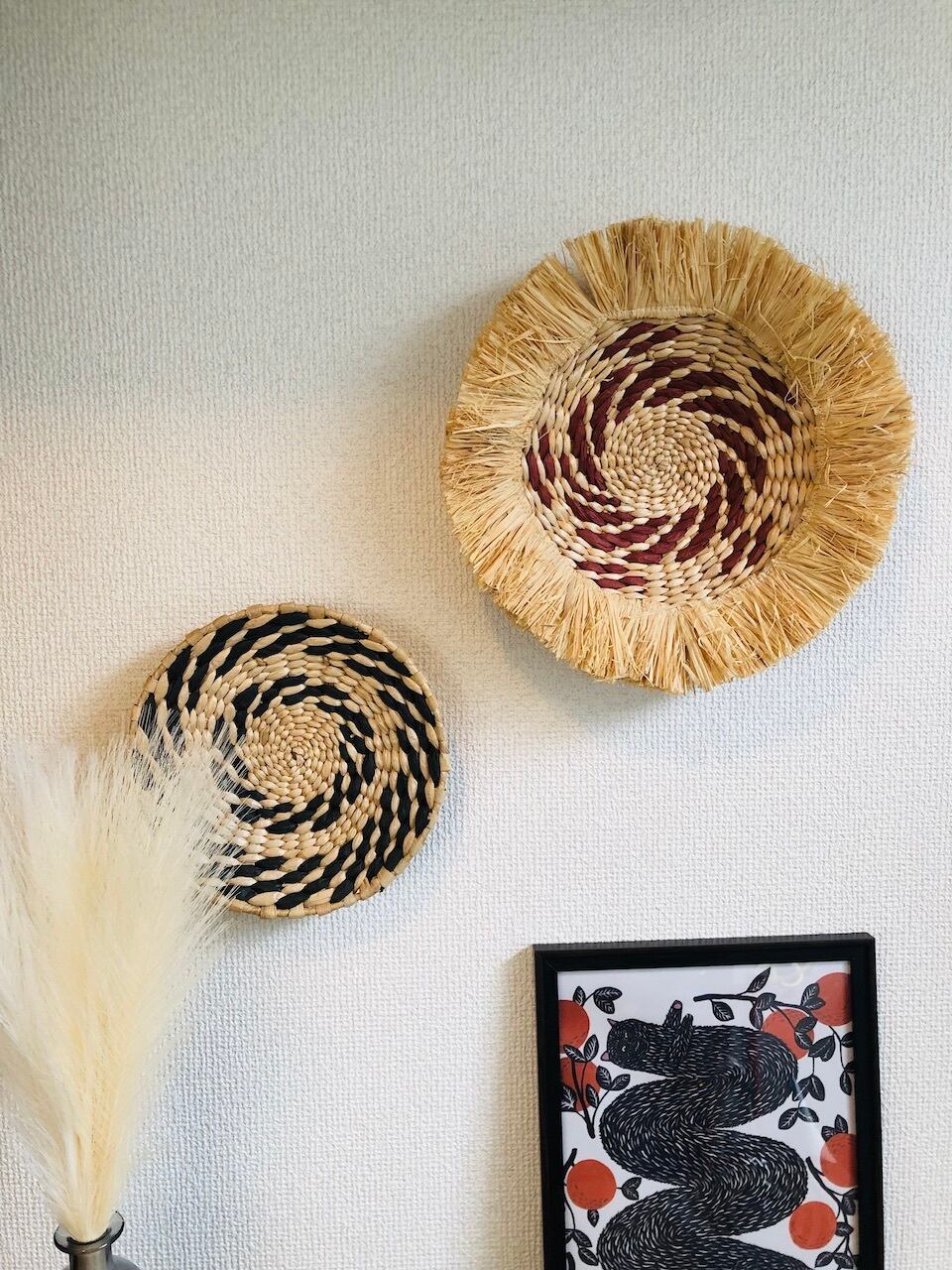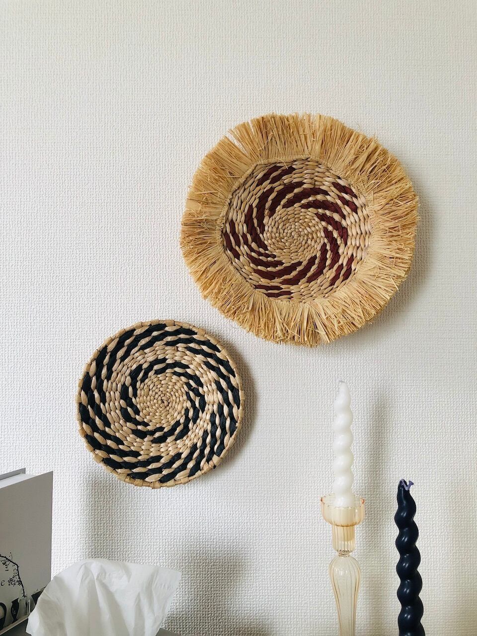 手織りで編まれた100%ストロー(わら)製の壁掛けプレートです。モダンでありながらも、温かみを感じさせるデザインで、リビングや玄関などのお部屋を素敵に飾ってくれます。手織りならではの独特の風合いや質感が、心地よい空間を演出してくれます。裏面に壁掛けできるリング状のロープがあるので、届いたらすぐに設置できるのもいいですね♪