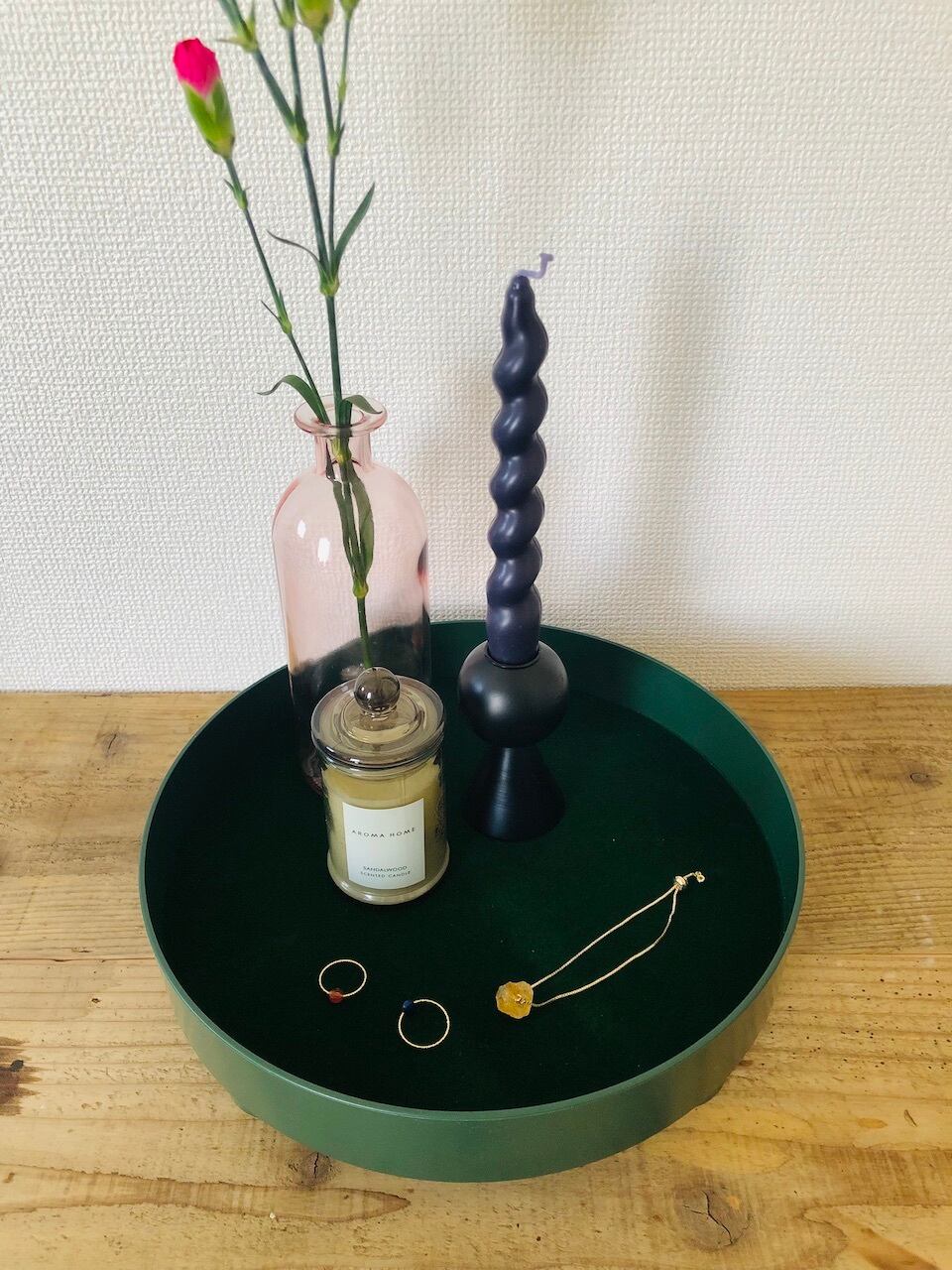 シンプルで実用的にお使いいただける卓上タイプの収納トレイです。トレイの上面はベロアのような布が張られており、上品さがあります。インテリアはもちろん、お気に入りのアクセサリーやコスメなどを入れても十分な大きめのサイズ感がポイントです。また、枠の高さがあるので小物が見えにくく、すっきりとした印象でおしゃれに小物を置くことができます。
