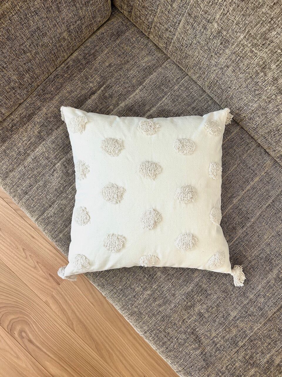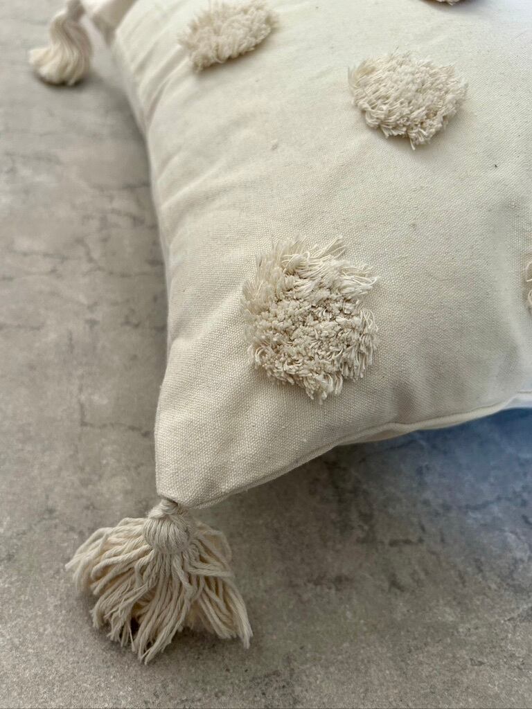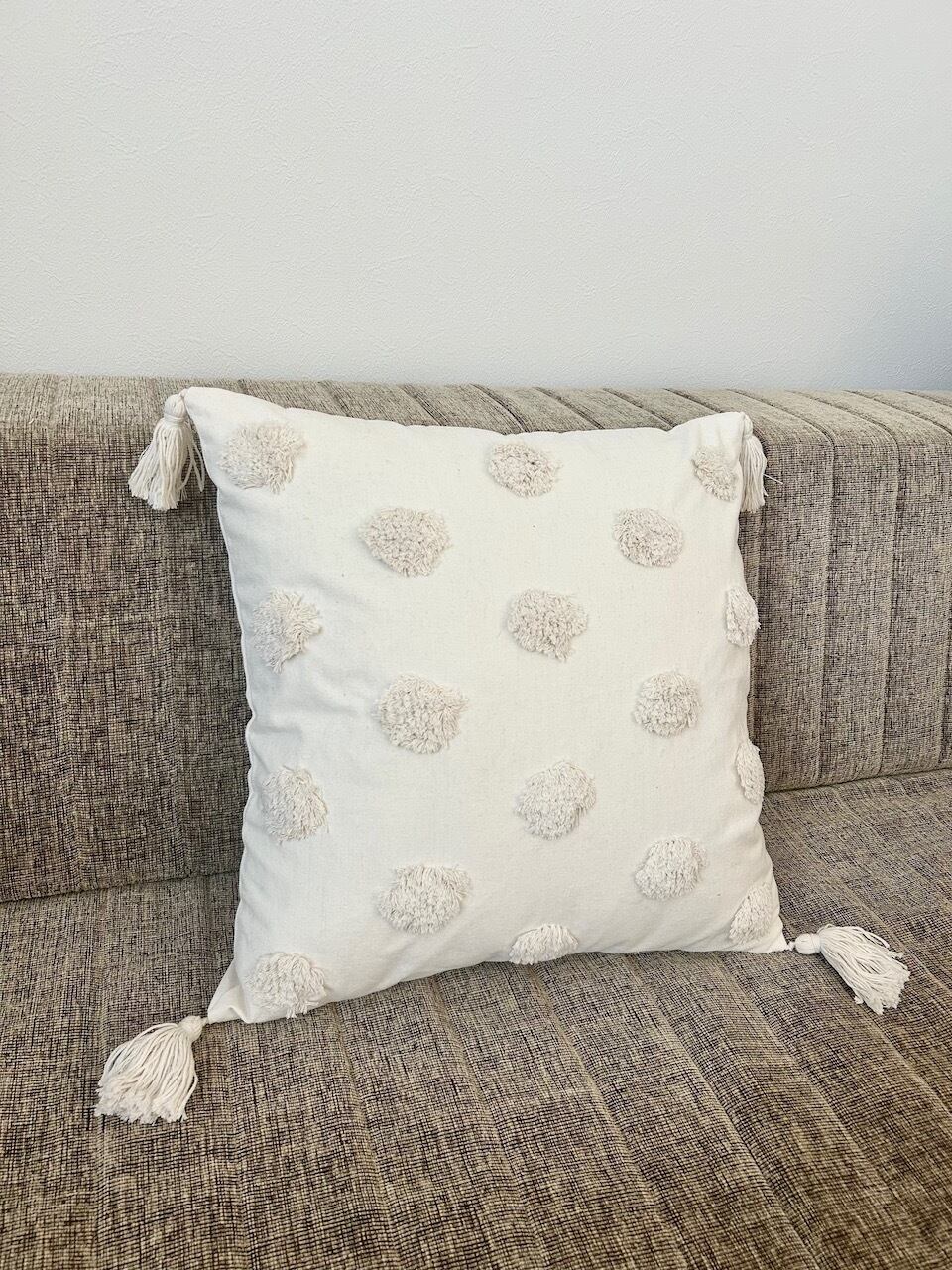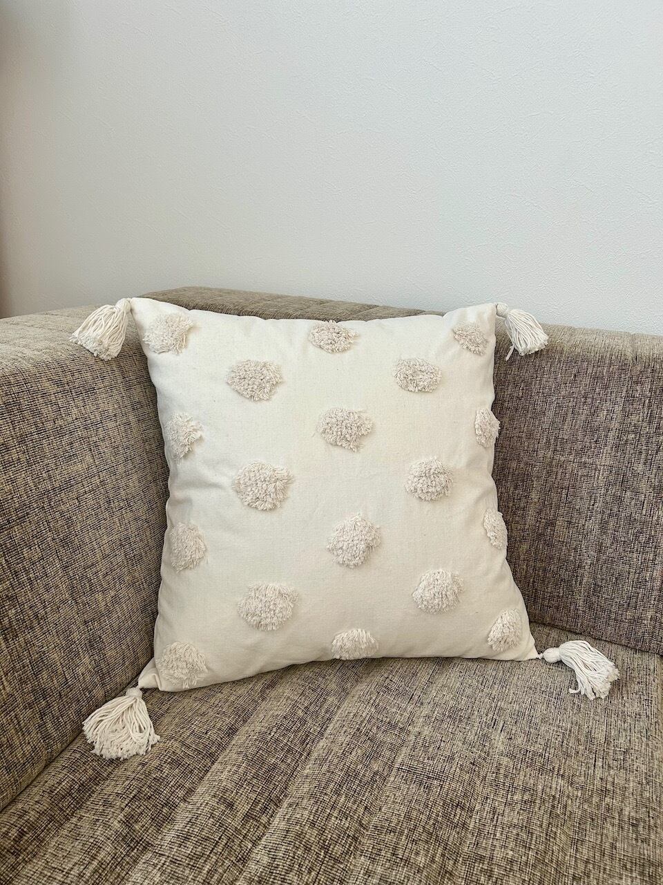 トレンドの水玉デザインが魅力的な、タッセル付きクッションカバーです。ディテールにこだわったシャギードットは、ナチュラルインテリアに自然に溶け込み、居心地の良いおしゃれな空間を演出します。リビングや寝室、さらには植物と合わせることで、お部屋に素敵なバランスを生み出しますよ♪